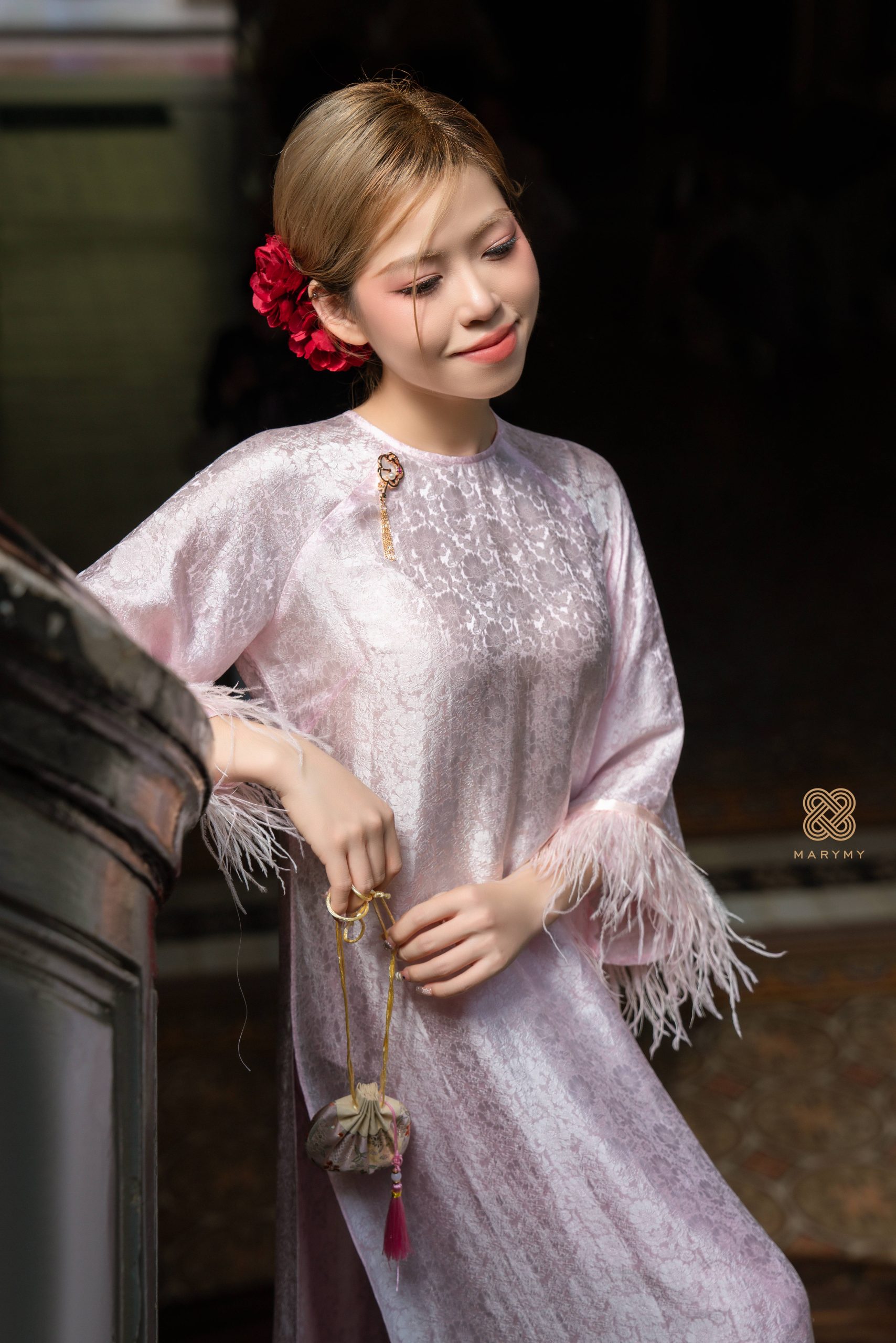 Áo Dài Cách Tân Vũ Tú MARYMY Chất Liệu Tơ Tằm Thiết Kế Tay Lông Vũ