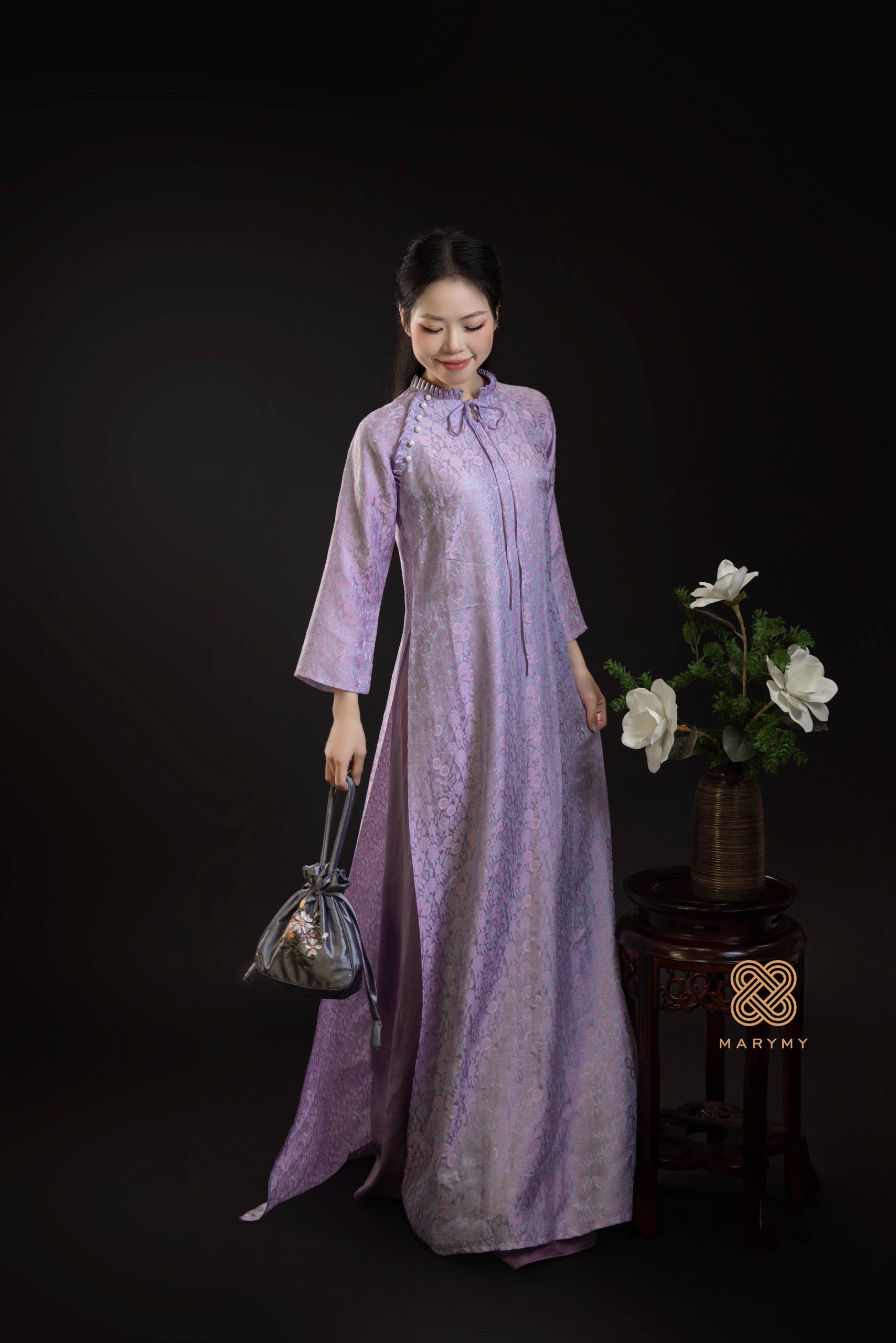 Áo Dài Cách Tân Khuê Vũ MARYMY Chất Liệu Gấm Cổ Xếp Ly Phối Nơ Và Ngọc Trai Thiết Kế Thanh Lịch