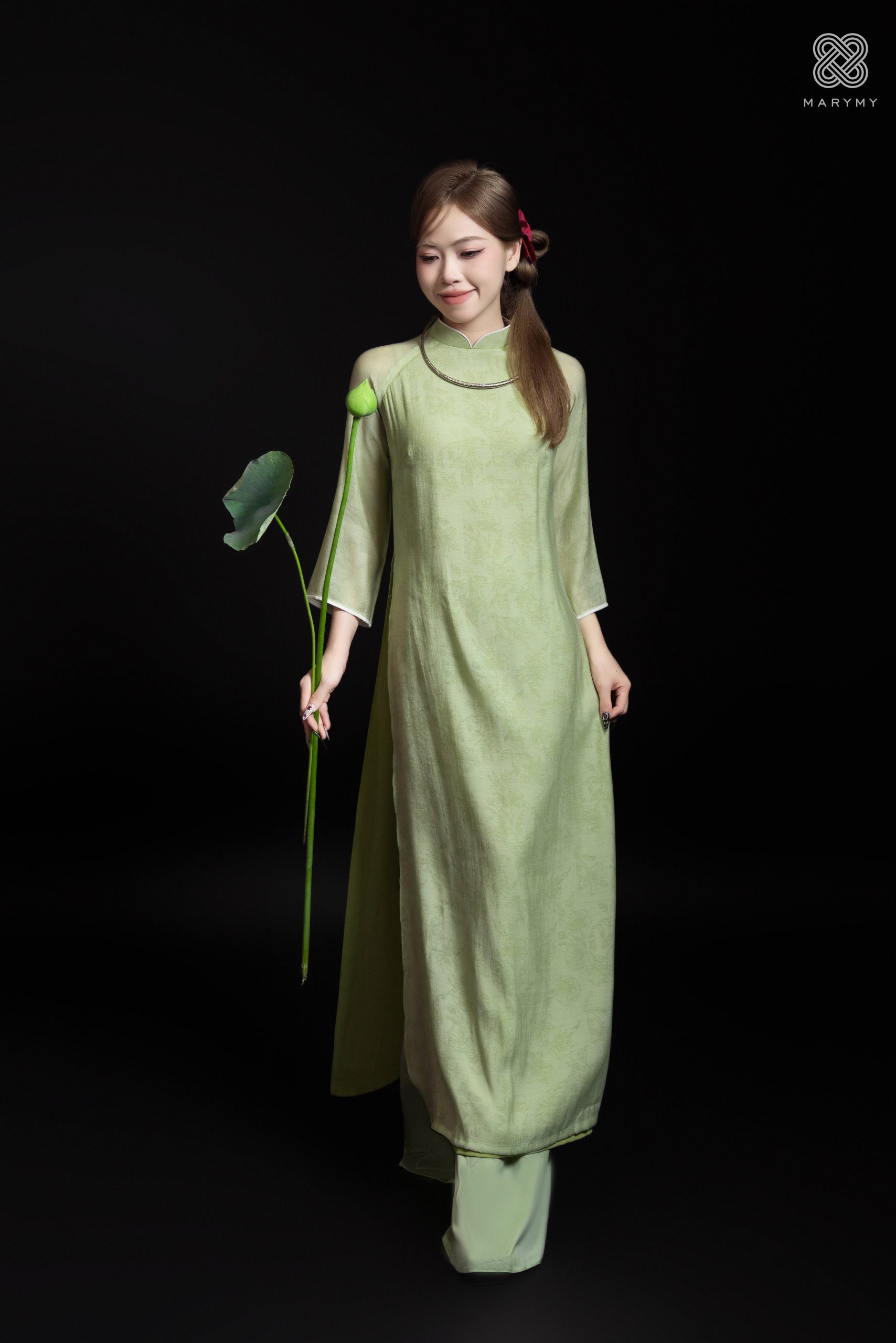 Áo Dài Cách Tân Yên Hạ MARYMY Màu Xanh Lá Mạ Chất Liệu Tơ Dệt Họa Tiết Hoa Văn Dệt Nổi