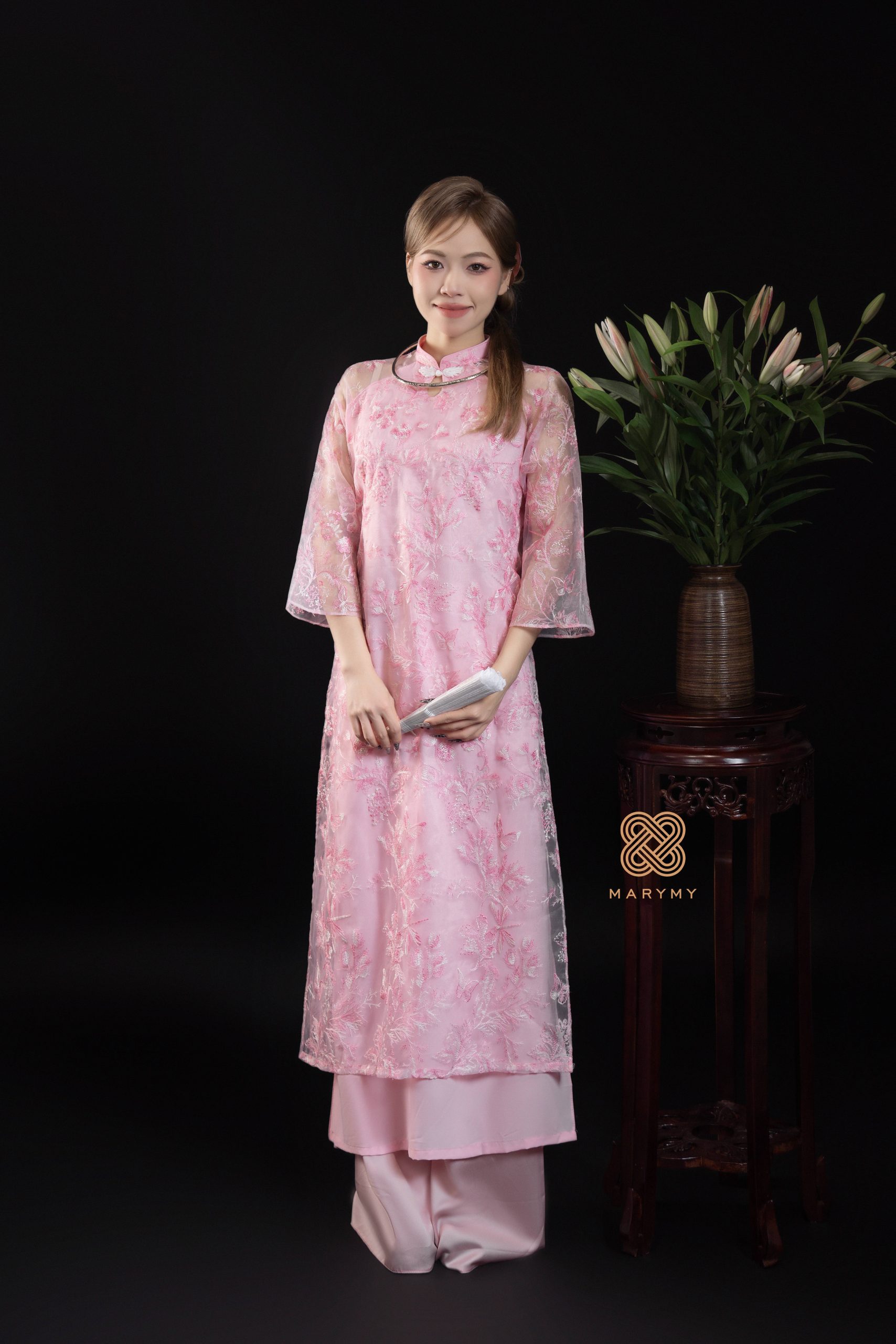 Áo Dài Cách Tân Nguyệt Anh MARYMY Màu Hồng Chất Liệu Tơ Mềm Họa Tiết Dệt Hoa Nổi Thiết Kế Thanh Lịch