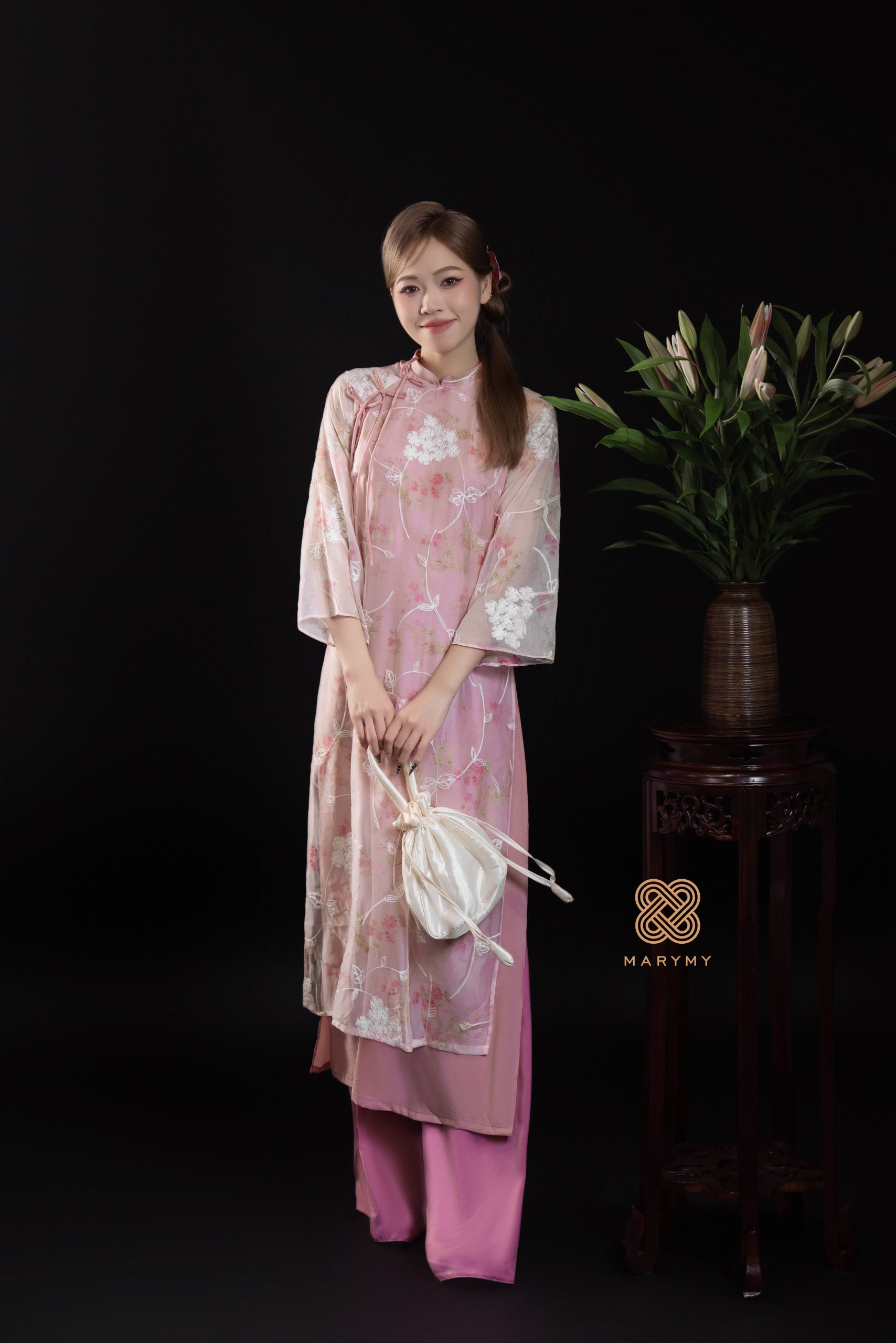 Áo Dài Cách Tân Vũ Liên MARYMY Màu Hồng Chất Liệu Tơ Mịn Dệt 3D In Hoa Vân Nổi